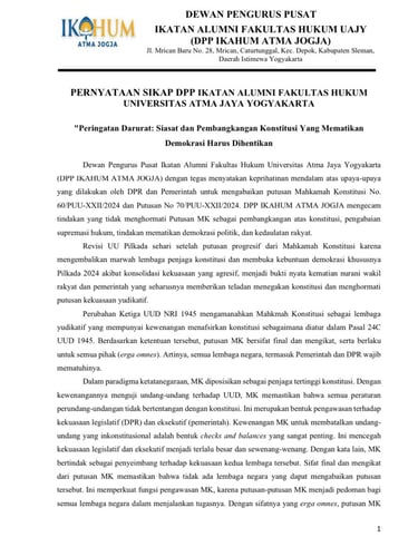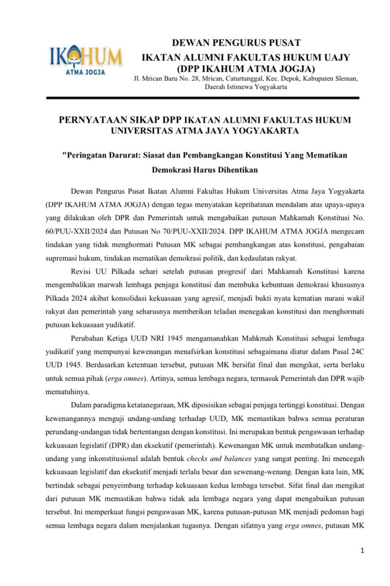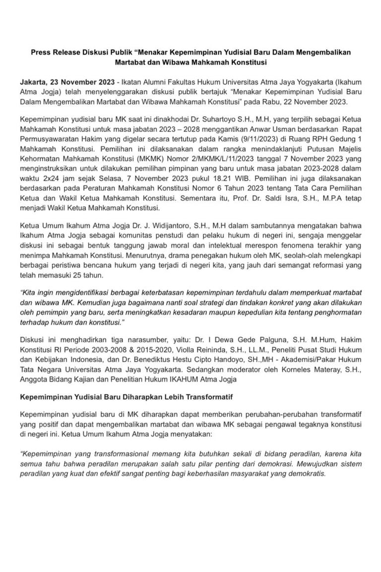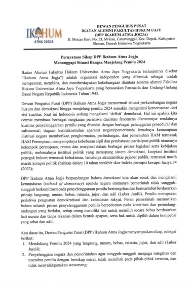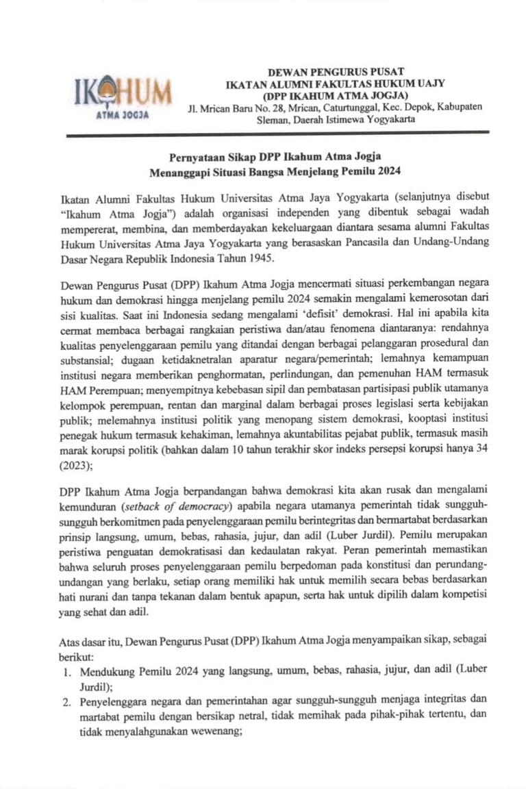 Pernyataan Sikap DPP Ikahum Atma Jogja Menanggapi Situasi Bangsa Menjelang Pemilu 2024.